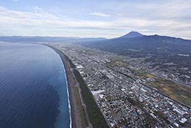 ・駿河湾の空撮 11月は駿河湾にてヘリコプターによる空撮を行いました。陸上と旅客機からは見ることができない角度と高さで富士山を望むことができました。沼津港から田子の浦まで弓形に続く海岸線と海から愛鷹山に登る緩やかな傾斜、背景に見える富士山は広大な景色でした。また、清水の近海では異なる潮の流れがぶつかってできる潮目を確認することができました。 |
