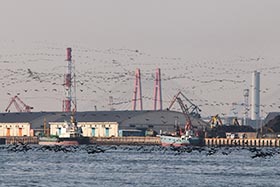 ・名古屋 12月は名古屋港と清水で客船飛鳥Vの撮影を行い、その行き帰りに車の取材でなければなかなか行くことができない蒲郡市にある竹島水族館と碧南市にある碧南海浜水族館を取材しました。また名古屋港では撮影の待機時間に何千羽ものカワウの大群に遭遇しました。昔名古屋港水族館でカレンダー撮影をしている時に、館内からカワウが列になって飛ぶ姿を見たことがあり、いつかまた見たいと思っていましたものを海上のボートから近い距離で見ることができました。5分間も途切れることなく海面近くを低空で飛んでいきました。 |