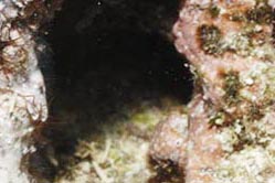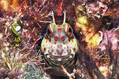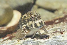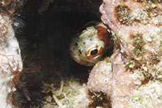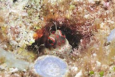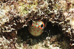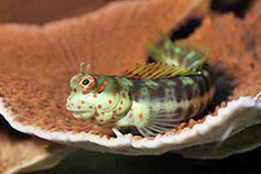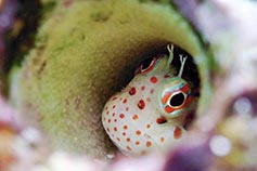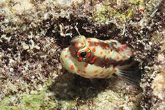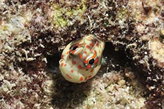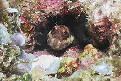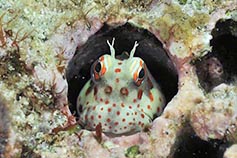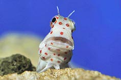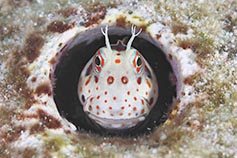 スズキ目・イソギンポ科・カエルウオ属の魚で、カエルウオの仲間としてはやや大型で、全長9〜12cmになります。屋久島以南、インド‐太平洋の亜熱帯・熱帯域に棲息し、体に多数の橙色斑がちりばめられ、レッドスポッテッドブレニーの別名で知られます。外洋に面した浅い岩場やサンゴ礁域の小さな穴を巣にし、珪藻を好んで食べます。穴から頭部だけを覗かせて外を見張っている事が多く、餌にする珪藻をそぎ取るのに都合が良い分厚いキュートな唇から笑っているような顔をした可愛い魚です。雄が雌を誘って自分の巣穴の入り口の内側壁面の周りに産卵させます。 |