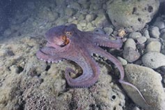熊本県は北部が有明海、南部が八代海と潮の干満差が大きいことで知られる二つの大きな湾と接しています。有明海では最大約6メートル、八代海では最大約4メートルの干満差があり、潮汐により多くの海水が東シナ海と湾内を出入りすることが特徴です。また、湾内には多くの川が流れ込んでおり、豊かな海を育んでいます。水俣市は鹿児島県との県境の北西部に位置し、天草諸島に囲まれた八代海南部の海と接しています。メインのダイビングポイントとなる湯の児島の周囲は岩場の先が砂地に囲まれており、水深10メートルに満たない岩場に多くの生き物たちが暮らしています。エントリーしてすぐに数メートルの水深で体長1メートルに迫るほどのマダイや大きなクロダイが泳ぎ回る姿を見られることは驚きです。マダコが多く生息しており、秋には卵を守る母ダコを観察することもできます。春から初夏にかけてはヒメタツの繁殖行動が見られることが有名で多くのダイバーがそれを目当てに訪れます。 |