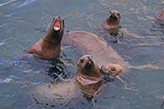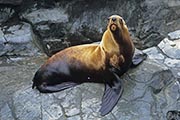 〜 トドpart2 〜 世界最大のアシカ科の動物(体長4m、体重1.1ton)で、北海道から千島列島、サハリン、カムチャツカ半島からアラスカ、カナダ、そしてカリフォルニアまで、北太平洋の寒冷な海域に棲息します。雄1頭に対し雌が10〜15頭のハーレムを作って繁殖し、最初に雄が繁殖地に上陸して海岸にテリトリーを作り、そこに後から雌が上陸して出産、交尾を行います。餌はミズダコやニシン、スケトウダラ、タラなどさまざまな魚で、天敵はホホジロザメやシャチだけと考えられています。昔は漁業関係者から「海のギャング」と呼ばれ、有害鳥獣として自衛隊などにも駆除されていましたが、最近は、北海道のニシンが乱獲されるなど、漁業によって餌を奪われて激減し、絶滅危惧種に指定されています。体が大きく獰猛そうだが人間に慣れやすく、水族館などでショーも行われています。 |