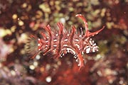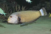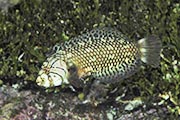 〜 オビテンスモドキpart2 〜 伊豆半島以南、インド・太平洋海域に分布する、鰭を広げたときにピンと立つ背鰭を持ち、のっぺらとした顔で体が平たいベラの仲間です。体にラインがあるところから「帯」で、背中に黒い点がある魚から「点魚(ス)」、「モドキ」は似て非なる、の意味で「帯がある点魚に似る魚」と言う意味で、英名はReindeer Wrasse「トナカイ・ベラ」です。砂礫やサンゴ片の海底に生息し、驚くと一瞬にして砂に潜り込み隠れます。また、石やサンゴ片を口で運んで寝床を作り、その下に潜って就寝します。色彩変異が大きく、淡緑色から赤色まで様々で、成魚と幼魚では色や斑紋が全く違います。幼魚は赤や茶色が多く、千切れた海草がふわふわ漂うように泳ぎ、危険が迫ると俊敏に砂に潜ります。 |
